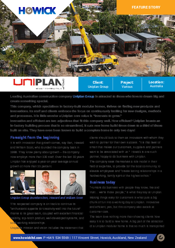 Uniplan’s mission and vision includes the statement that clients should look to them as innovators with whom they wish to partner for their own success. “It is that level of smart that makes our customers, suppliers and partners want to be associated with us.” Howick is one such partner, happy to do business with Uniplan.
